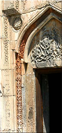 C'est à l'extérieur de l'enclos, en arrivant sur le site, qu'on est happé par la vision de cette chapelle, dont l'architecture précaire s'imbrique intimement à la falaise et à la roche, mettant d'emblée en évidence ce dialogue incessant entre la pierre et les signes des hommes, qui fait le trait distinctif de Geghard. |