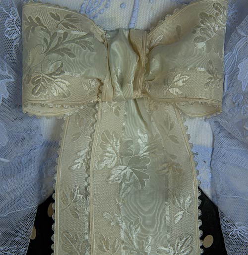 La cornette repliée vient se croiser sur le devant, laissant apparaître les deux parties brodées à l'arrière. Elle forme deux énormes coques au dos grâce à un jeu de plis savamment épinglés.