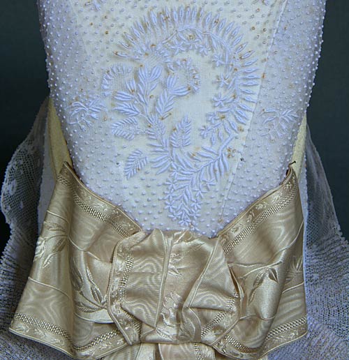 Ce fond en tulle est entièrement brodé de petits pois, avec au centre, à l'arrière, un motif typique de la fin du 1er Empire.