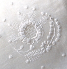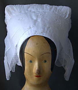 La calotte matelassée est dépourvue d'arceaux. Le fond est en mousseline brodée, plissée grossièrement dans les angles.