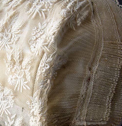 L'avant est garni d'une double dentelle mécanique tuyautée sur les côtés. Deux belles épingles de nacre ornent le sommet.