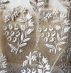 Le fond très ample est en tulle à mailles carrées brodé à la main de branches fleuries. On remarque le généreux paillage en cœur dans les angles.