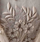 Le fond est grossièrement brodé de bouquets assez volumineux, l'ampleur en est résorbée par deux doubles plis latéraux, légèrement décalés. Le bouquet de l'avant est brodé tête-bêche.