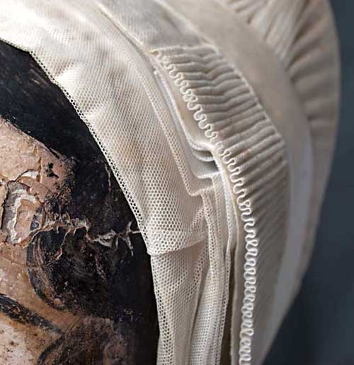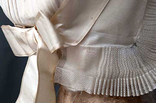 Le fond de la coiffe est en tulle à petites mailles rondes, paillé en coeur. L’ampleur est résorbée par cinq petits plis de chaque côté, chaque petit pli étant replié en creux vers le centre.