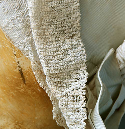 Le fond est brodé de motifs en relief aux points de sable, de bourdon et de feston sur un tulle à mailles rondes, typique de la fin de la période. Le coeur de certains motifs est ajouré en écartant les mailles. Les broderies sont parallèles et très rapprochées. Un pli creux central très profond et deux plis plats sur les côtés cachent les deux tiers de la broderie.