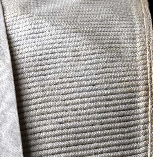 Le bandeau de la bonnette est confectionné en piqué mille raies. Le fond en toile de coton a été plissé à l'ongle et placé sur un dessous en satin de soie/coton ivoire paillé en cœur mais invisible.