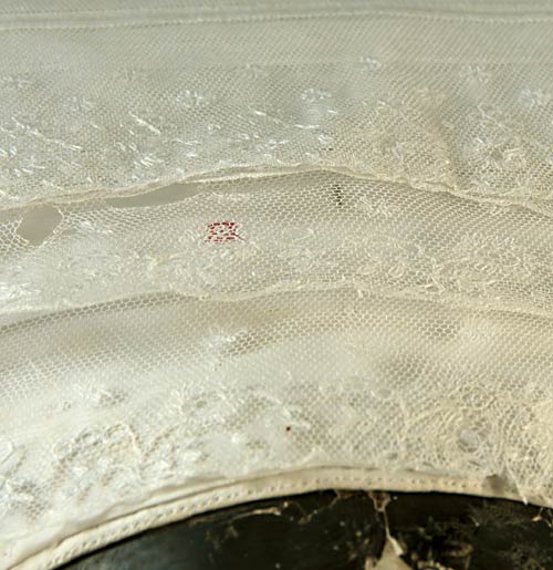 Un carton souple renforce la bonnette en piqué de coton, recouverte du fond de coiffe composée de mousseline et d'une dentelle attenante. La broderie sur le tulle est mécanique imitant la dentelle.