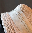 À l'avant, la passe légèrement brodée se termine par une dentelle mécanique paillée droit en oreillons, et est doublée d'une dentelle posée à plat. Un large ruban de faille de soie bleu pâle à replis est posé sur cette passe.