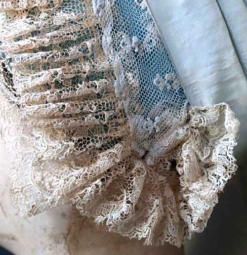 À l'avant, la passe est bordée d'une dentelle mécanique façon Calais. Une dentelle grossièrement paillée est retournée vers l'arrière. En dessous, la même dentelle est posée à plat tout autour du visage.