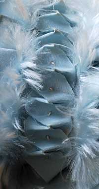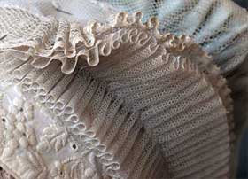Il s'agit de reformer les petits plis cousus et marqués sur la toile des coiffes, technique difficile qui s'effectue en général sans amidon. La difficulté s'accroît encore sur de la mousseline ou sur du tulle car les empreintes ont souvent entièrement disparu. Il est ici nécessaire de faire un amidon léger. |