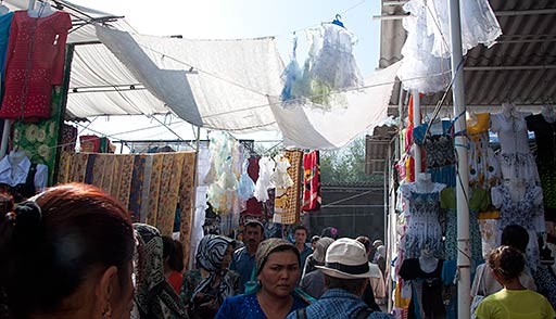 Les villes ici s’étalent, elles se ressemblent dans ce bruissement constant mais nonchalant de l’Asie. Nous sommes à Marguilan, le jeune dans le taxi nous emmène au bazar, il va nous accompagner tout le jour, entre bienveillance de l’hospitalité et fascination devant ceux qui voyagent. L’immense bazar et ses quartiers, les tissus, les épices, les céramiques… Les stands touche à touche, resserrés, qui laissent passer la file dense des acheteurs. On achète des tissus, des raisins secs, des abricots, du safran, et c’est à chaque fois, après les difficiles échanges par gestes seulement souvent, le bonheur rayonnant du commerce accompli. Je me dis que depuis des siècles c’est ainsi dans ces régions, la marchandise peuplée d’humanité, saturée d’histoires qu’on raconte, de rires de ceux qui observent. Les objets, les nourritures, tout ce qu’on vend, dans le fouillis des voix, dans les fumées chaudes des grillades… les parcours dans les bazars d’Asie centrale m’ont appris la grandeur de ce commerce là. Non que ce qu’on achète ou vend soit secondaire, mais il est investi intensément de relations qui le dépassent, le fortifient, lui donnent une densité qui fait mémoire et sens.