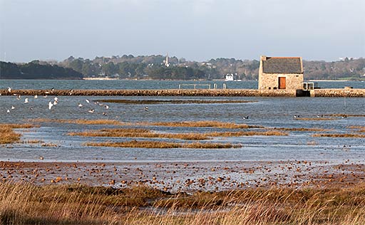 Comme les goélands, les paysages ici s’enflamment vite, mettant devant les yeux des rêves qu’ailleurs on ne soupçonne pas. Nous avons pris le bateau près de Port Anna, où les maisons et les pins se mêlent dans un dialogue lisse, presque urbain. Mais on quitte vite cette rive aménagée du golfe, on pique au milieu, les vagues gonflent. Vent de Noël et ses averses vite portées à la lumière. On va vers l’île d’Arz dans une symphonie de gris et d’ocres et de bleus sombres. On laisse Boëdic et sa chapelle dans la lumière. Arz est proche, mais le passage d’eau – un quart d’heure peut-être – transforme le monde. Aller vers les îles, c’est se défaire de soi-même, des certitudes, de la solidité des paysages. De la terre ferme d’où l’on vient, tout se distend – repères et routes qui s’amenuisent, grains d’eau qui vous lavent et lavent encore. Comme s’il fallait dériver de soi-même. Et plus la traversée peut-être est longue ou difficile, plus l’espoir naît, d’une autre terre à la mort abolie, où les hommes pacifiés vaqueraient seulement au respect de la terre, à leurs amours.